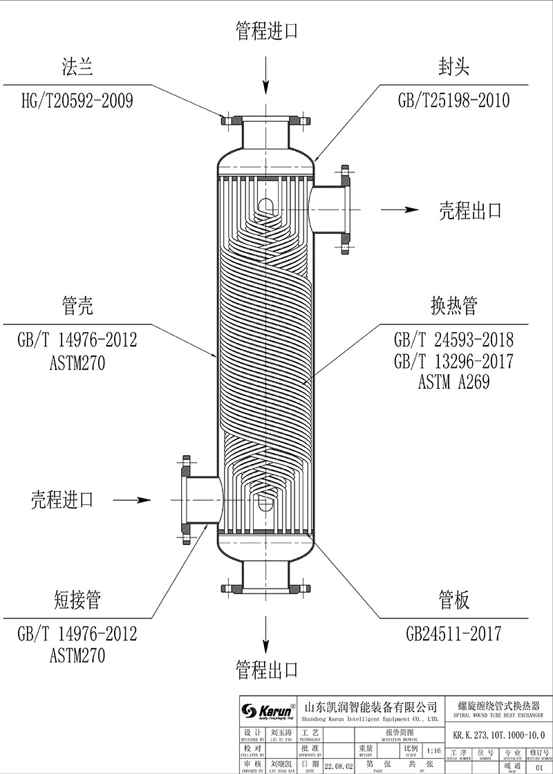 2.非對稱流設(shè)計:螺旋纏繞管式換熱器管程與殼程容積不相同,殼程容積能達(dá)到管程容積的 4.2 倍,以滿足醫(yī)藥,化工等各種不同復(fù)雜工況要求。